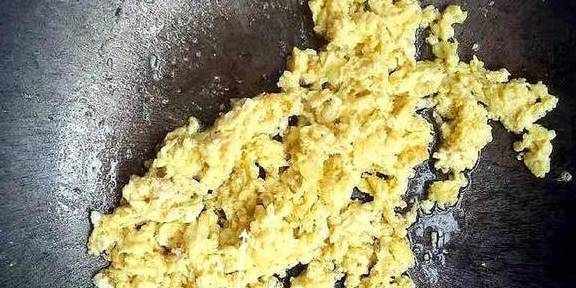 取出一口鍋,記著鍋中不要有水預防油加熱時炸鍋燙到自己。鍋中倒入適量油,油溫加至三成熱時倒入蛋液,快速攪拌開,炒至雞蛋分散開成雞蛋碎,裝出備用。