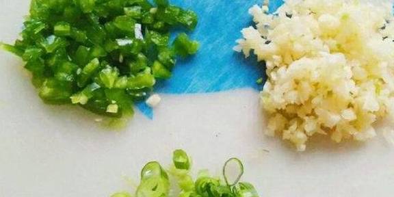 然後我們把小蔥洗幹凈切成蔥花,蒜去皮切成蒜末,青椒也洗凈切成碎粒留著備用。
