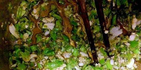 鍋中在加入多一點的油,油溫三成熱時,把蔥、蒜、青椒倒進去小火炒出香味。