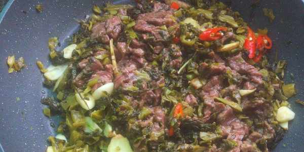今天要分享一道我們這裡的酸菜炒牛肉做法,把牛肉切片再醃制一下,超市買來的酸菜洗凈切碎,同牛肉一起炒熟即可。是一道營養豐富的下飯菜。