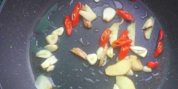 第七部:鍋留底油,放入辣椒圈、薑片、蒜片炒香。