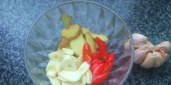 第一部:把紅椒切圈,5瓣蒜切片,薑也切片,全部切好放碗裡備用。