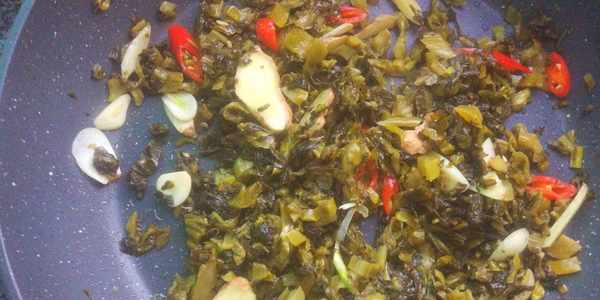 第八部:再倒入切好的酸菜大火炒一分鐘,炒出酸菜的香味。