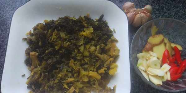 第二部:把超市買來的一整包酸菜洗幹凈,這種酸菜是整棵的,而且有點咸,所以清洗一下能去除一點咸味,然後把它切碎,切好放盤子裡備用。