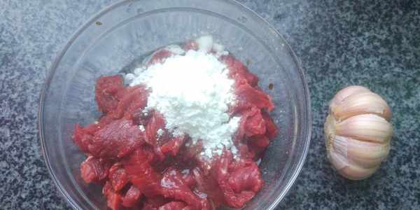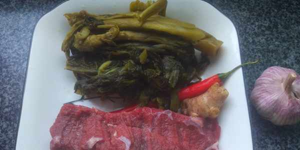 牛肉400克,酸菜1包,紅椒1個,薑1片,蒜5瓣,淀粉2勺。