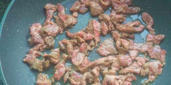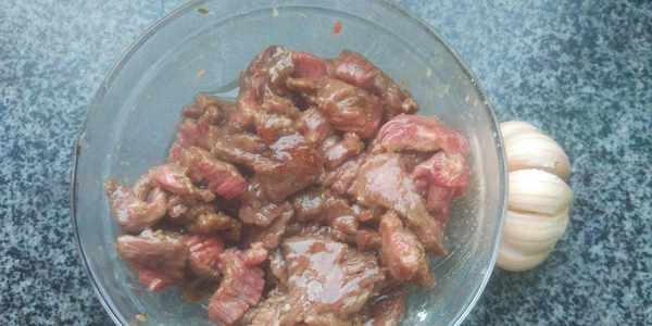 第五部:起鍋燒油,油溫7成熱放入醃制好的牛肉煸炒,把牛肉炒至變色。