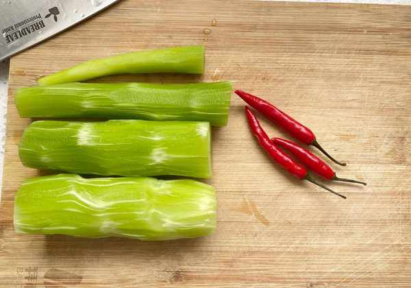 3、萵苣用削皮器削去外皮,清洗幹凈,小米辣洗凈備用。