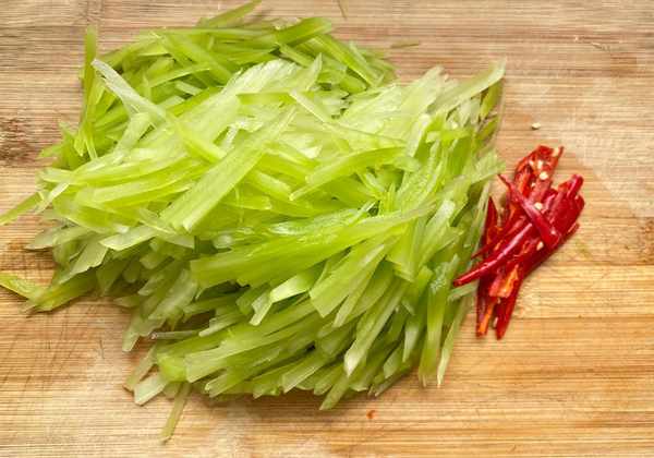 4、把萵苣切成細絲,小米辣切絲備用。不會切絲的也可以用刨絲器刨成萵苣絲,口感上沒有手切的好吃,可能是刨絲減少的水分較多。