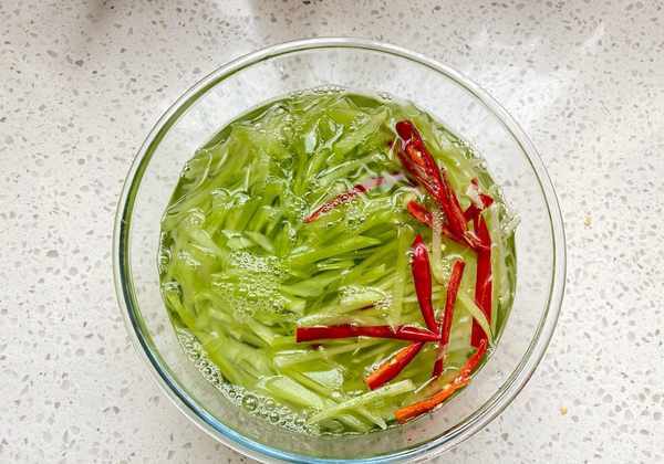 5、把切好的萵苣絲和小米辣,一起放入玻璃碗裡,然後倒入涼開水(或者冰水),浸泡十分鐘。浸泡可以讓萵苣絲涼拌以後更加脆爽。