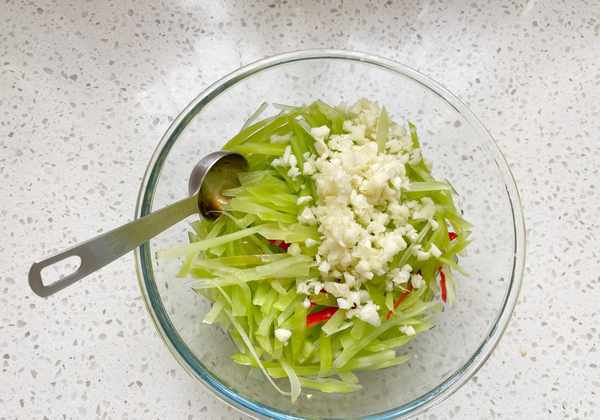 7、把泡好的萵苣絲,小米辣,瀝幹水分,放入蒜末。
