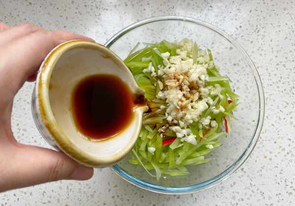 8、把調好的調味汁,淋入萵苣絲上,用筷子拌勻,然後裝盤。
