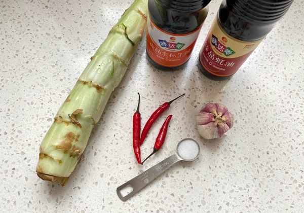 【食材】:萵苣1根,小米辣3個,糖少許,蠔油1勺,生抽2勺,大蒜1頭,食鹽少許,植物油適量,花椒粒少許