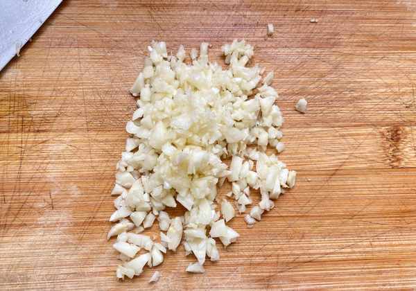 6、浸泡的時候,把大蒜去皮,切成蒜末備用。現在新鮮的大蒜上市瞭,氣質脆美,可以多放點口感更好,老蒜比較辛辣,酌情用量。
