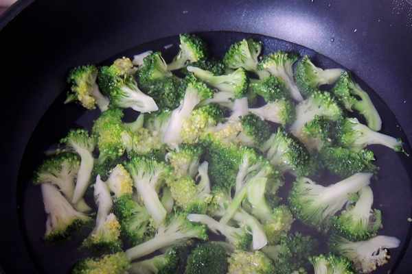 5.鍋中放入清水,大火煮至沸騰,加入少許鹽和食用油,然後將西蘭花放入沸水鍋中,焯燙30秒左右,撈出來浸入涼水裡面降溫,然後瀝幹水分備用。