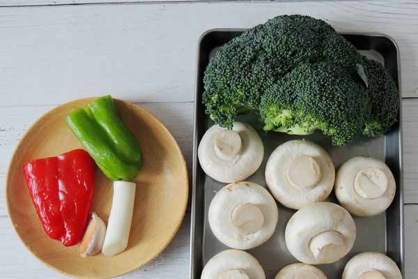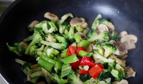 【所需食材】:西蘭花1顆,口蘑8個,青椒半個,紅椒半個,大蒜1瓣,大蔥1小段,蠔油1大勺,鹽1勺,食用油1勺。