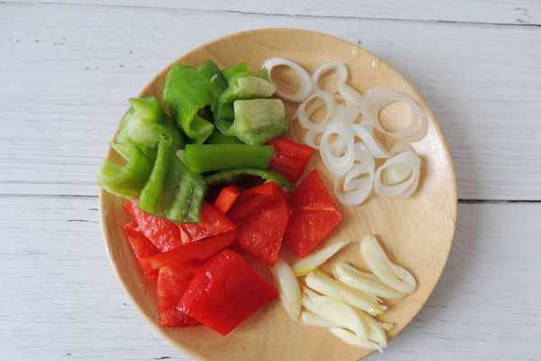 4.將青紅椒清洗幹凈,去蒂去籽,改刀切成塊狀,大蒜切成薄片,蔥段切成圈。