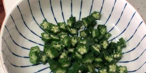 2,凈之後先裝入一個盤子中,之後鍋中燒水,先加少許食鹽,再加一點點的食用油。再把洗凈的秋葵也加進來焯一下水,大概焯水兩分鐘左右之後再撈出來,過一下涼水之後撈出來,去掉根部,再改刀切成這種厚一點的片,切好之後先裝入一個大碗中。