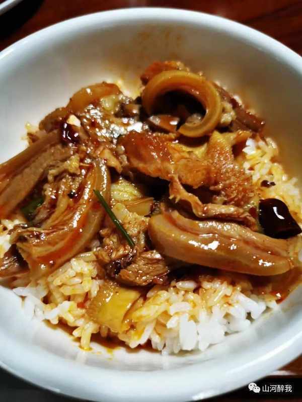將羊肉火鍋連肉帶湯澆在米飯上,湯汁浸透米飯,吃起來特別香,很下飯