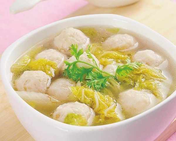 準備材料:白菜200克,雞肉丸75克,花生油、鹽、味精、蔥段、薑片、香油各適量