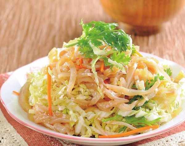 準備材料:白菜200克,海蜇150克,胡蘿卜10克,蒜泥10克,香菜10克,鹽、味精、白糖、醋、生抽、香油各適量