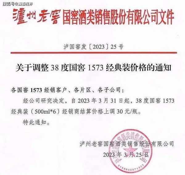 近日消息,瀘州老窖國窖 酒類銷售股份有限公司 3月25日發佈調價通知,自3月31日起,38度國窖1573經典裝(500ml*6)經銷商結算價格上調30元/瓶。 據媒體公開的不完全統計,今年春節以來已有約10傢酒企宣佈對旗下核心產品進行調價或停貨。 業內人士預計,隨著白酒消費逐漸復蘇,預計會有越來越多的知名規模酒企加入調價隊伍。