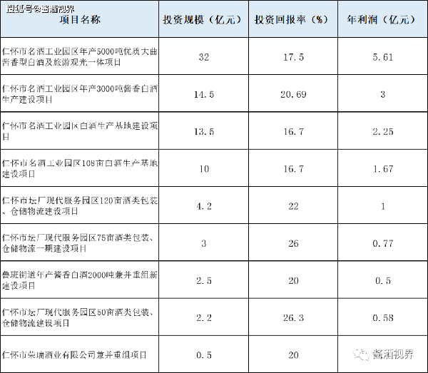 3月27日,貴州省投資促進局發佈仁懷市名酒工業園區白酒生產建設及酒文旅觀光項目。 該項目總投資30億元,規劃占地255畝,規劃建設年產4000噸優質大曲醬香型白酒。 項目選址位於仁懷名酒工業園區,項目建成投產後,預計年銷售收入11億元,年利潤5.77億元,投資利潤率19.23%。 其將進一步帶動地方醬酒產業快速發展和文旅一體化建設,拉動區域經濟增長,提升當地社會經濟效益,增加社會附加值。