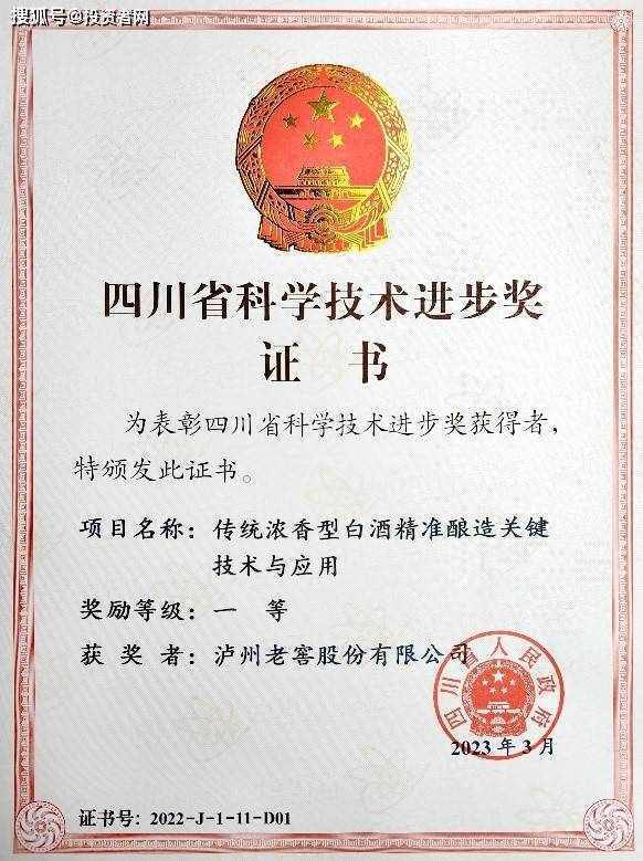 3月28日,四川省科學技術獎勵大會暨第三屆“四川傑出人才獎”頒獎儀式在成都舉行。由瀘州老窖牽頭,聯合北京工商大學、四川輕化工大學、重慶大學和瀘州智通自動化設備有限公司共同完成的“傳統濃香型白酒精準釀造關鍵技術與應用”成果榮獲2022年四川省科學技術進步獎一等獎,成為行業唯一獲此殊榮的創新成果。瀘州老窖股份有限公司副總經理、安全環境保護總監張宿義作為成果第一完成人代表瀘州老窖現場領獎。