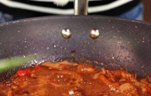 第五步,炒鍋先預熱一下,待熱後,加上油,放入冰糖,等到冰糖融化成泡沫狀的時候,倒入雞爪翻炒上色,上色之後放入薑片和小米椒翻炒