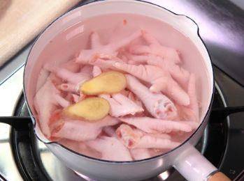 第二步,在鍋裡面加上適量的清水,冷水放進雞爪,加上兩片生薑片,大火煮開,焯一下水