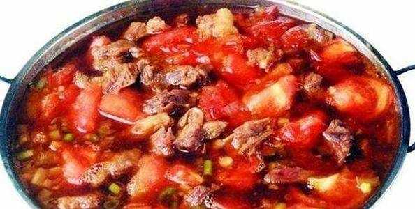 3、將肉倒入燉肉的湯中,放入西紅柿,燉至西紅柿變爛。