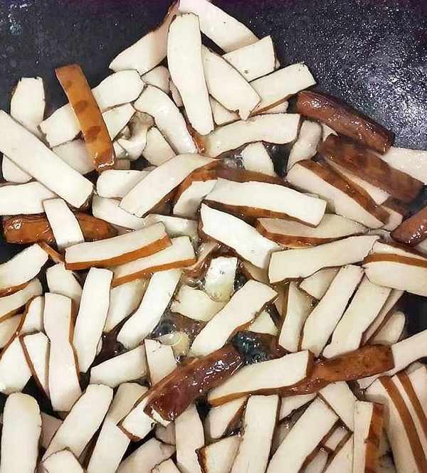 韭黃和豆幹炒好之後,我們先不要著急下鍋,將油預熱至一定溫度時就可以下鍋翻炒瞭,起鍋燒熱,熱鍋中加入金龍魚油,開火燒至油溫為65℃時,放入切好的豆幹,大火炒出香味,炒至豆幹表面的顏色漸漸變淡時,加入生抽,蠔油,食鹽調味,轉中火繼續翻炒片刻,這樣可以使調味品與豆幹充分的混合在一起,從而可以增添其口感,使其吃起來更香,更入味。炒至豆幹表面6成熟時即可。