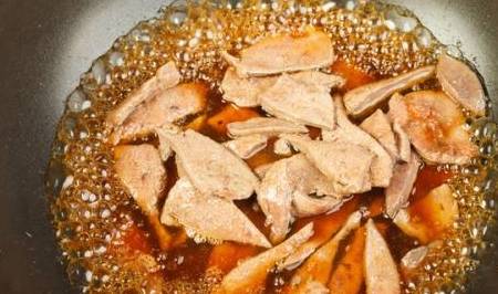 3.加入精鹽,味精,胡椒粉轉小火保持湯汁微沸,再下入豬肝片煮熟。