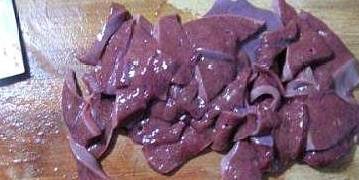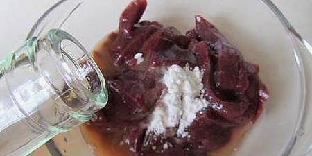 2.豬肝剔去筋膜,洗凈,瀝去水分,切成大薄片,放入碗中。