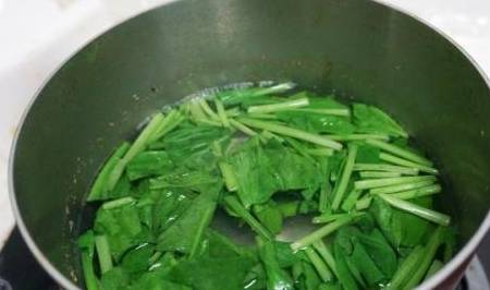1.菠菜擇洗幹凈,切成小段,放入沸水鍋中焯燙一下,撈出過涼,瀝水。