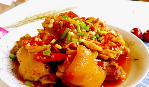 接下來就是按照平時炒菜燉肉的程序做豬手瞭,蔥薑絲放入鍋中,豬蹄放進去,並加入冰糖等所有的調料,半鍋水開始煮,煮熟以後,收汁,當地人還會加入一些醋,為瞭提高口感。如果喜歡吃可以多加一些,看自己的需求。