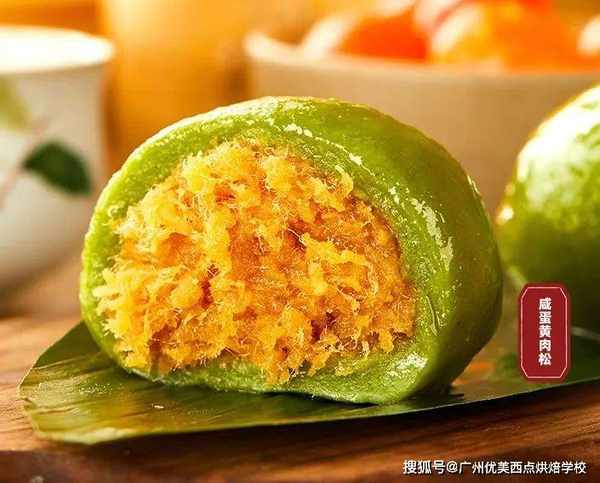 蛋黃肉松青團,采用優質咸鴨蛋黃,餡料油而不膩,蛋黃發紅,香氣撲鼻;而肉松可搭配以豬後腿肉制成、蓬松柔軟、鮮香細膩的肉松。