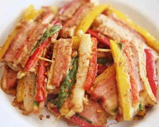 這是韓星秋瓷炫帶火的一道料理,把蟹棒、杏鮑菇、金鑼無淀粉火腿、甜椒、蔥段切成差不多長度碼好,用牙簽串成穿,裹一層蛋液下鍋煎至兩面金黃。出鍋後撒點辣椒面就可以開吃瞭。一串入嘴,杏鮑菇的軟嫩、金鑼無淀粉火腿的Q彈和彩椒的甜脆完美搭配,是道好看又好吃的料理。