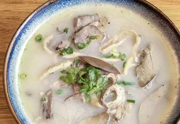 在吳忠,一碗貨真價實的羊雜,包含心、肝、肺、肚、腸、頭等部位。這其中,羊肺尤為重要,肺洗凈後灌入面漿,煮熟後變得雪白豐腴,切開成條就變成瞭西北著名的面肺子。面肺子和其他各種雜碎煮熟之後,配上羊肉、羊骨熬成的好湯,加上秘制的調味料,倒入放瞭蔥花、薑、蒜末的大碗裡,再加上西北特制的油辣子,一碗吳忠羊雜湯就可以上桌瞭。
