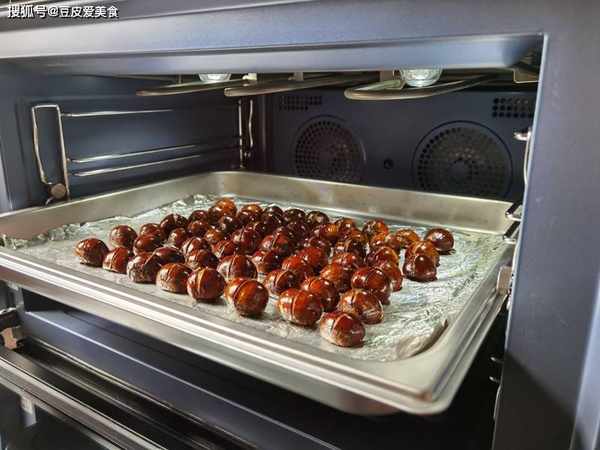 4、烤盤上鋪層錫紙,把板栗一粒粒擺上去,不要重疊,放入烤箱,200度烘烤10分鐘左右,再取出,重新裹上一圈蜂蜜水,重新放入烤箱,繼續烤15分鐘左右,完成。