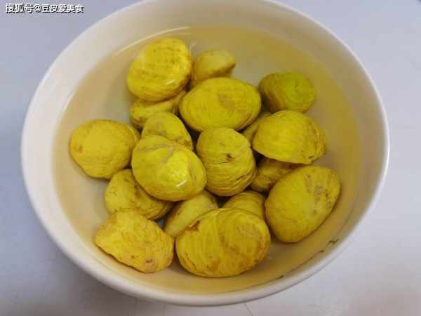 1、把板栗清洗一下,用刀在板栗底部切個小口,再把板栗放入水裡煮開,關火,靜置等到水不燙手瞭,就開始剝板栗。要註意不要等到水涼瞭再剝,不然會非常難剝。當然,如果能買到現剝的板栗,更方便。