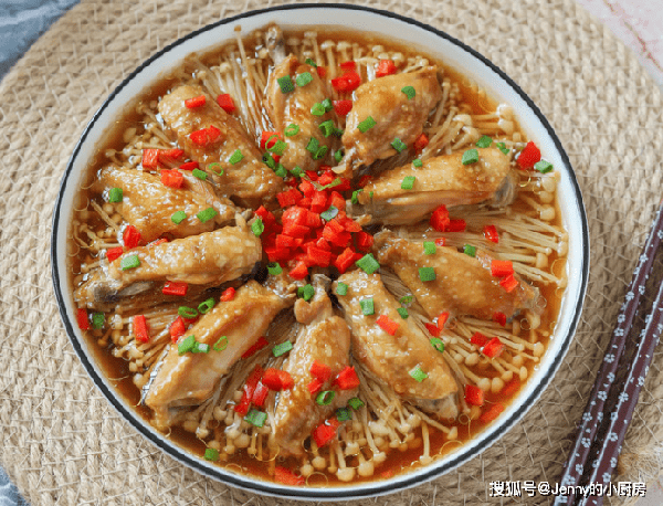 雞翅醃好後,放在金針菇上擺好,再放入蒸鍋,大火蒸十五分鐘。時間到後撒些胡蘿卜丁,再繼續蒸五分鐘。