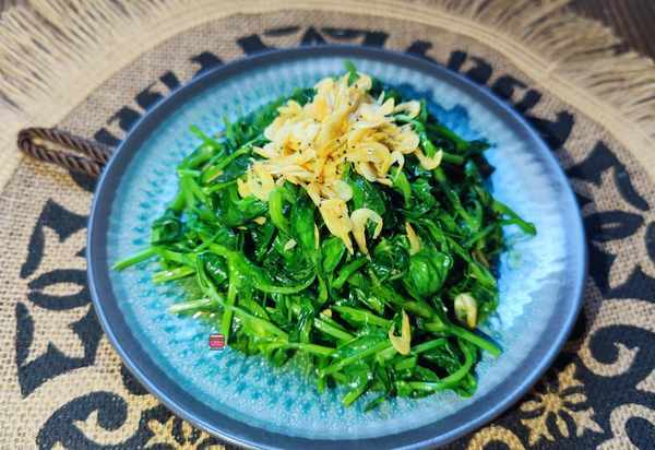 1、 豌豆尖掐去老根和黃葉清洗幹凈,大蒜切末備用。