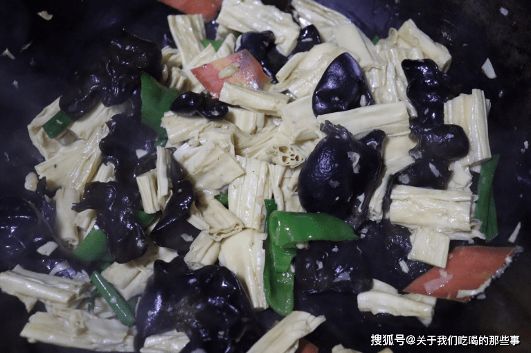 4、放入腐竹、木耳,大火翻炒一會兒,淋入碗裡的料汁,小火燒一會兒,充分入味後開大火收汁,湯汁濃鬱後即可出鍋。