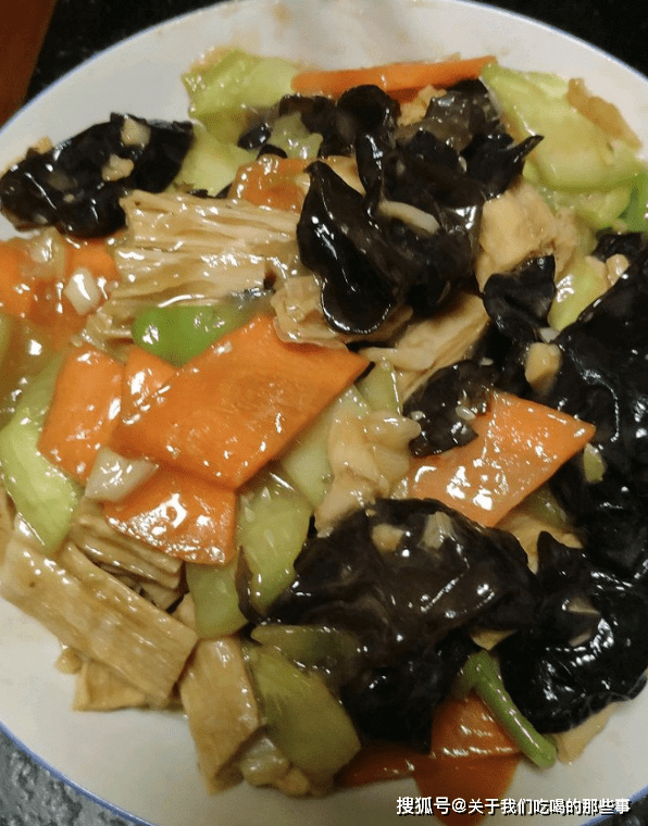 準備腐竹、木耳、青椒、紅椒、胡蘿卜、蔥薑蒜、幹辣椒、白糖、食鹽、胡椒粉、生抽、淀粉、食用油。