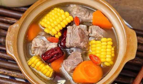 4、接著倒入玉米、胡蘿卜、紅棗繼續燉20分鐘。最後放兩勺食鹽,一把枸杞完成。