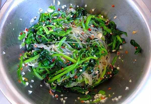 粉絲提前泡發好,撈出來切段,菠菜摘掉老根老葉清洗幹凈之後切段,水開把菠菜粉絲一同下鍋,燙30秒後撈出來,用水沖涼控幹水分,放在盆中,