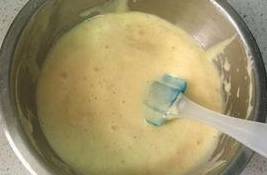 第二天早晨,把已發酵的面糊用勺子輕輕地攪動,把裡面的空氣都排出去。再將蔥、火腿腸切成丁,加點食鹽,繼續攪拌至均勻。