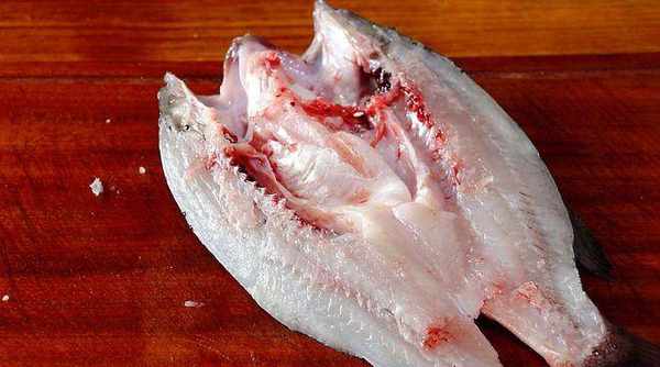 2、 鱸魚處理好以後用水沖洗幹凈,用刀從魚的背部劈開,接著在兩邊的魚肉上劃上兩刀方便入味。