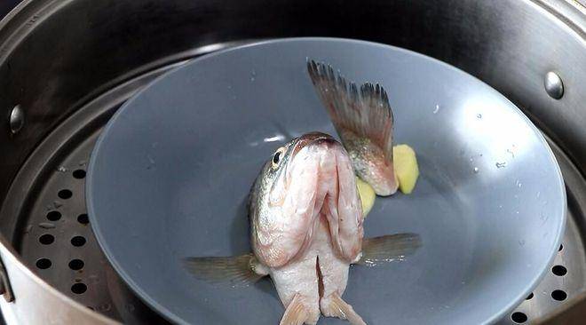 5、 把魚頭和魚尾放入蒸鍋內蒸熟,蒸好以後取出放在盤子的兩端。