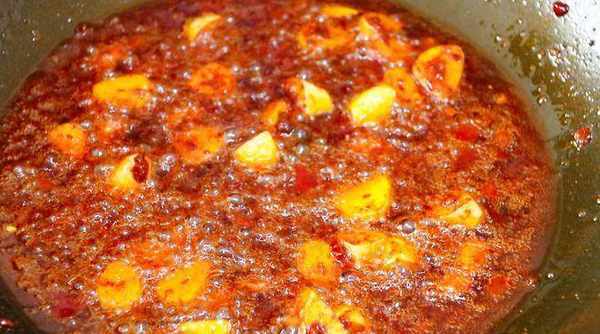 6、 另起一口鍋,鍋中倒油,油熱後下入大蒜和生薑爆香,接著倒入少許豆瓣醬和火鍋底料,等到炒出紅油之後往鍋中加水煮開。
